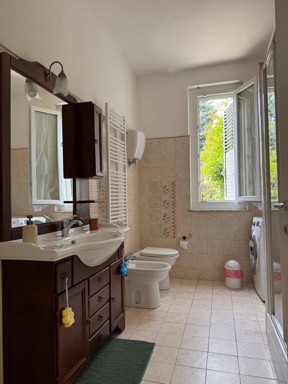 Casa Manuela ha un bagno spazioso, pulito, con doccia idromassaggio e lavatrice. E’ disponibile un asciuga capelli.